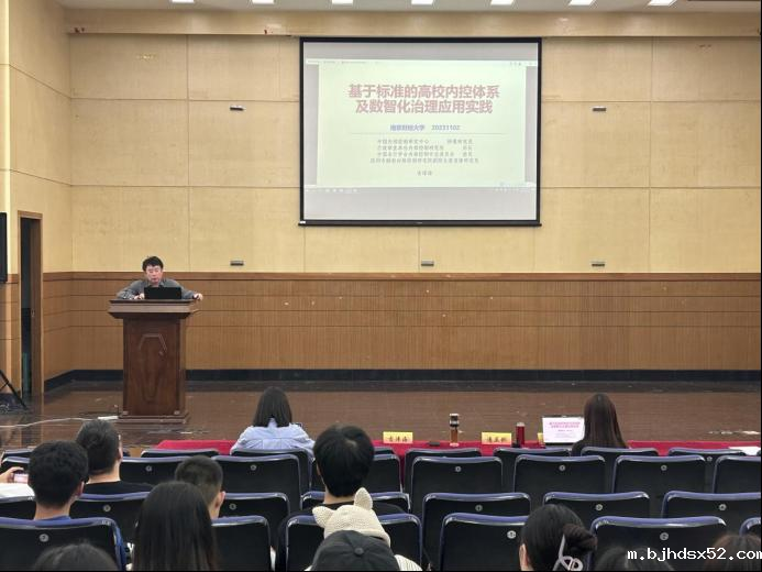 为提高研究生对于如何通过数字化和智能化提升组织内部控制和治理现代化水平的认识,11月2日,bjhdsx52特邀中国内部控制研究中心特邀研究员、行政事业单位内控研究所所长吉津海先生以及重庆医科大学办公室潘亚俐副主任一行四人,为同学们带来了《基于标准的高校内控体系及数智化治理应用实践》专题讲座。本次讲座由bjhdsx52主办,副院长李翔教授主持,约200名在校研究生参加。